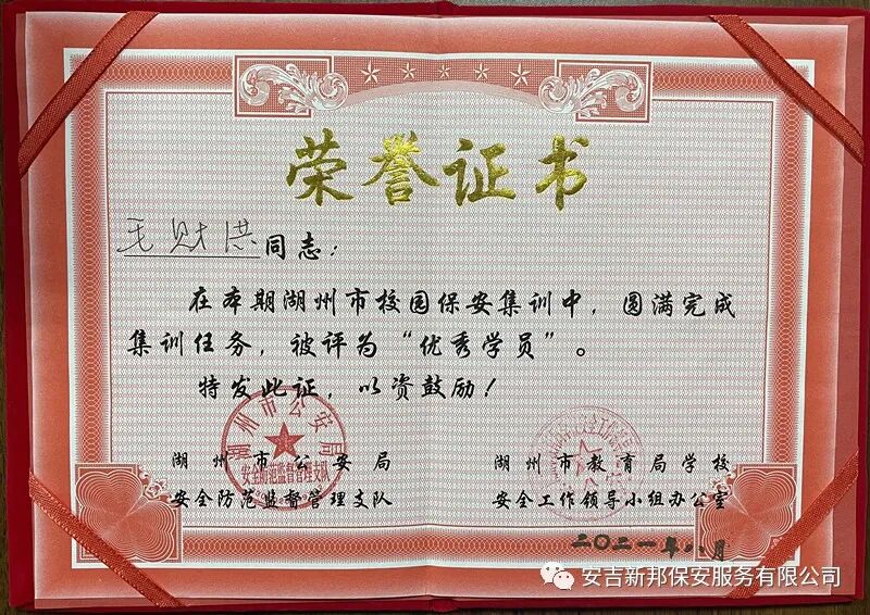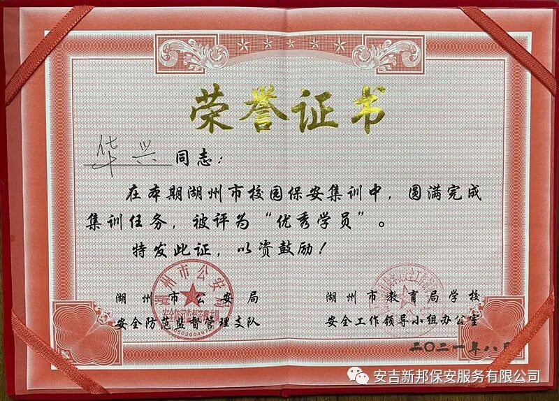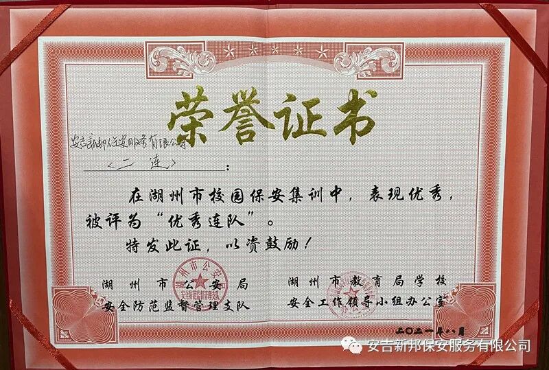 在此次集训中,我公司因表现优秀,被评为“优秀连队”,以及11名保安学员为评为“优秀学员”。